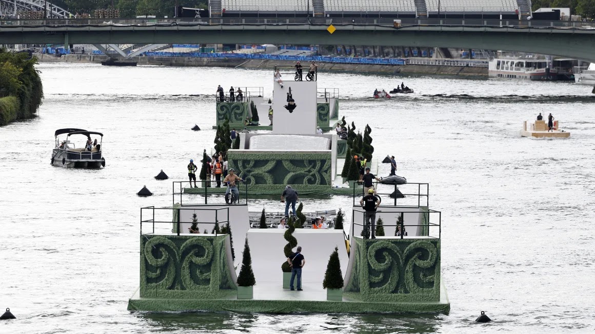 Boats and cast members rehearse on the River Seine for the Opening Ceremony of Paris 2024 Olympic Games on July 24.